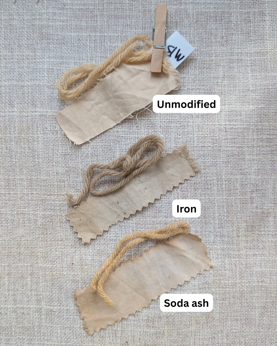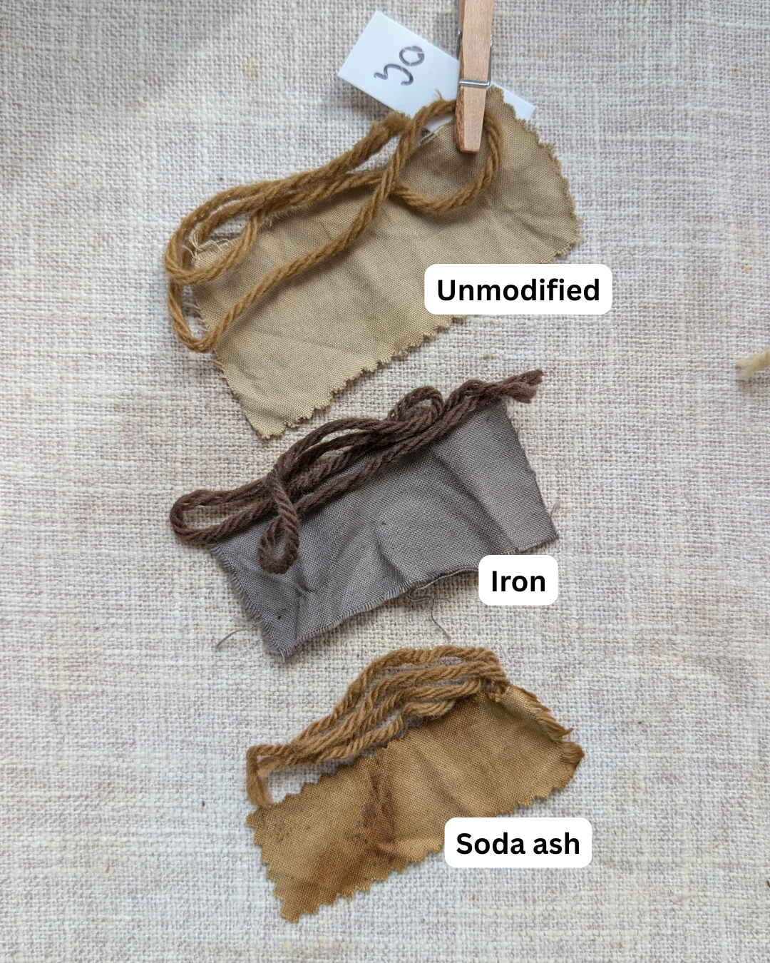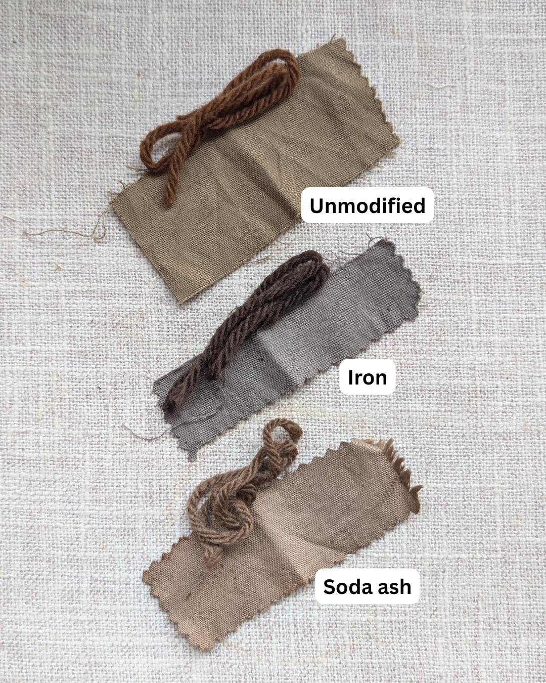 I separately used soda ash, following the same process. The amount of time each fiber scrap spent in the bath is relatively variable - I just wanted to get a rough idea of the modifier effects here. The fibers spent at least 2 hours in the dye bath, except some sumac samples.